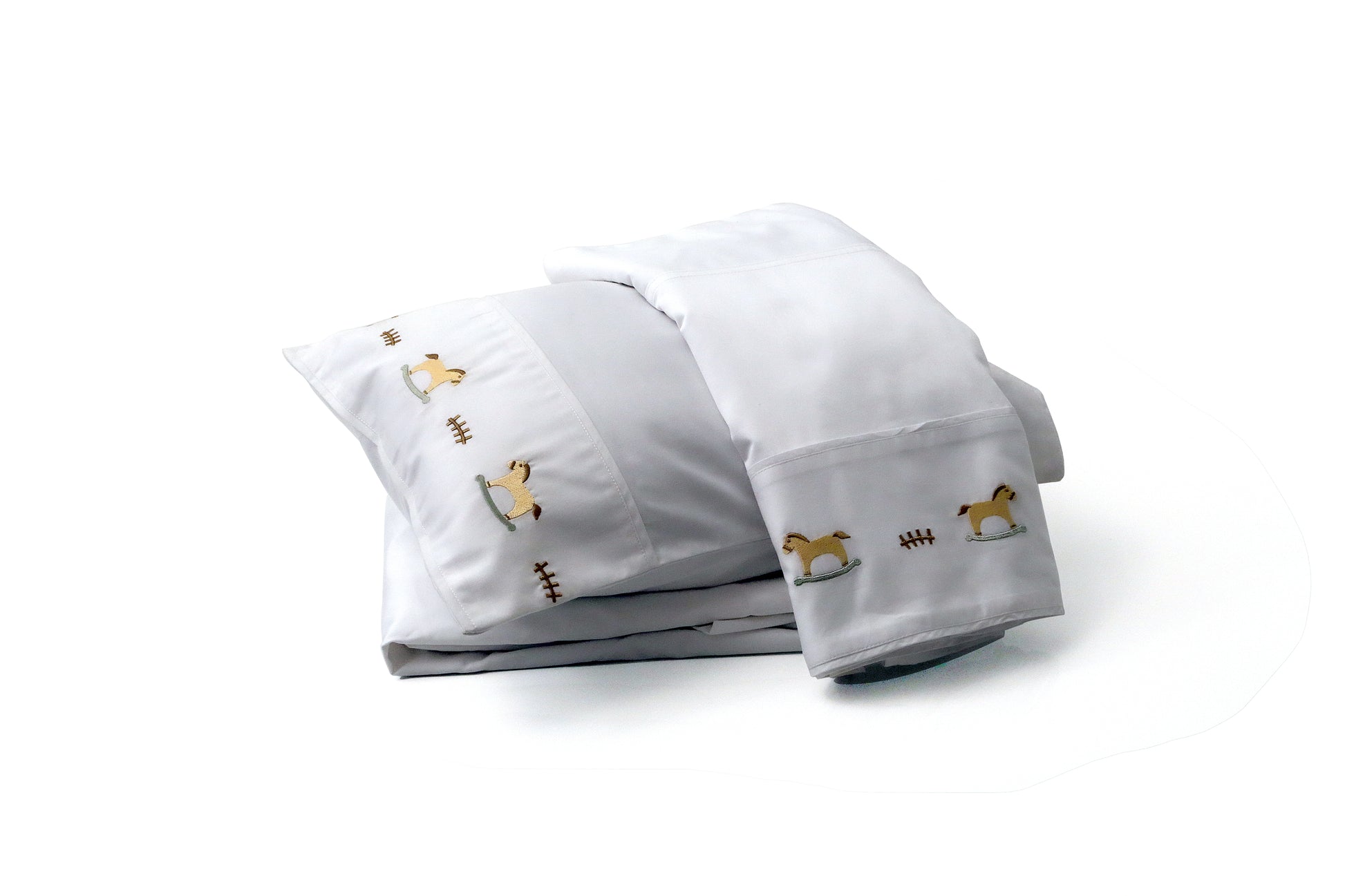 O Jogo de Lençol Bordado da Coleção Cavalinho traz o charme lúdico do cavalinho de balanço em um bordado delicado, que deixa o quartinho mais acolhedor e cheio de encanto.