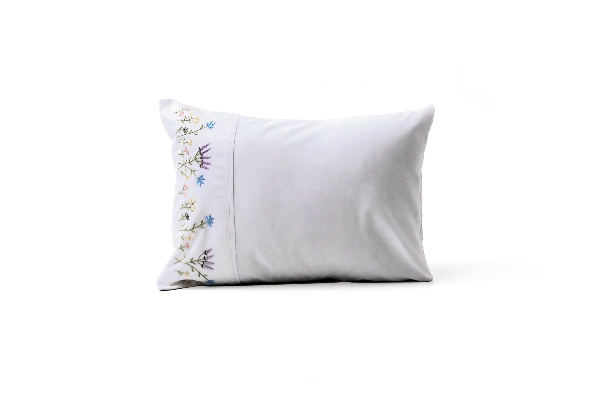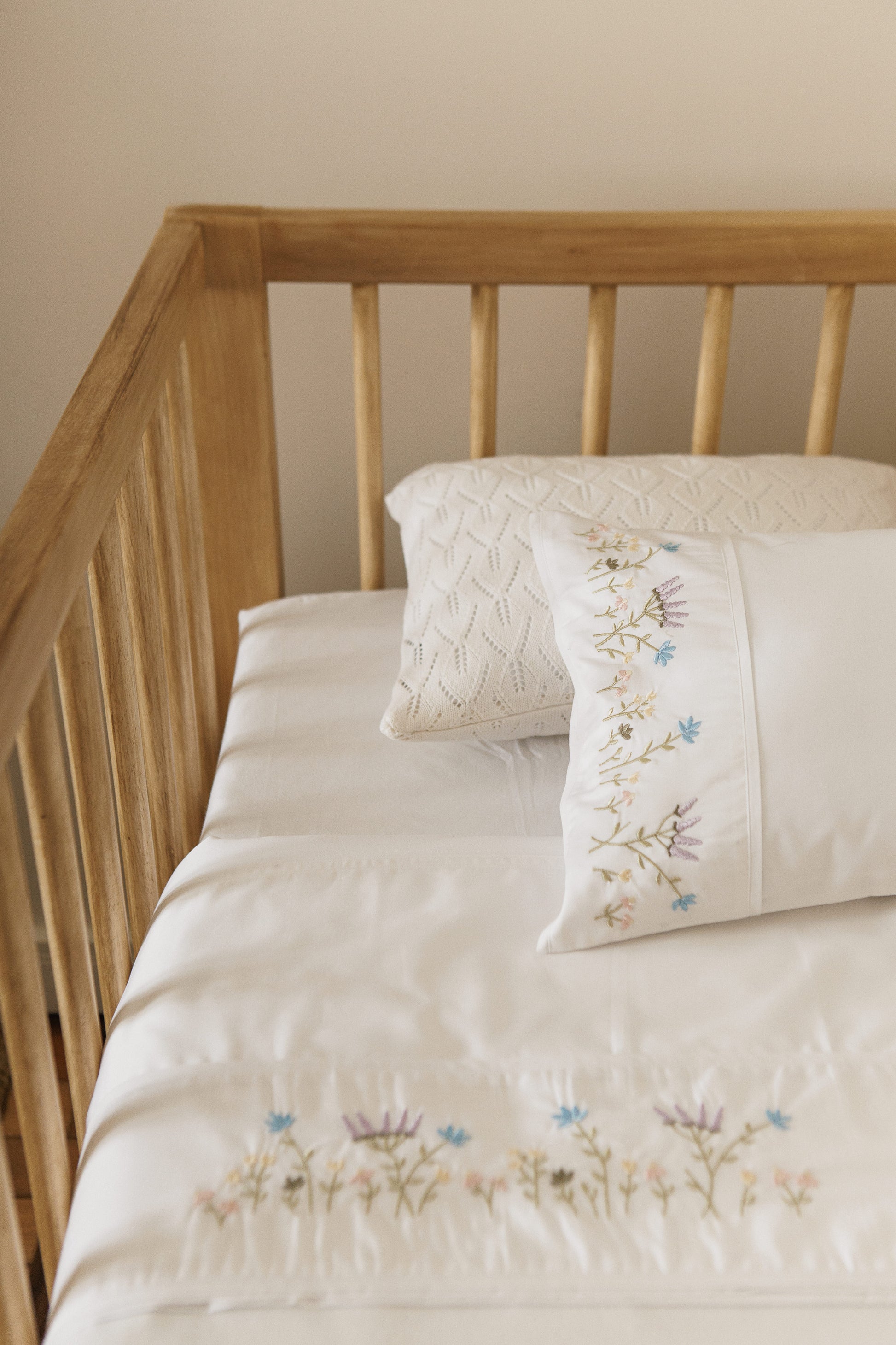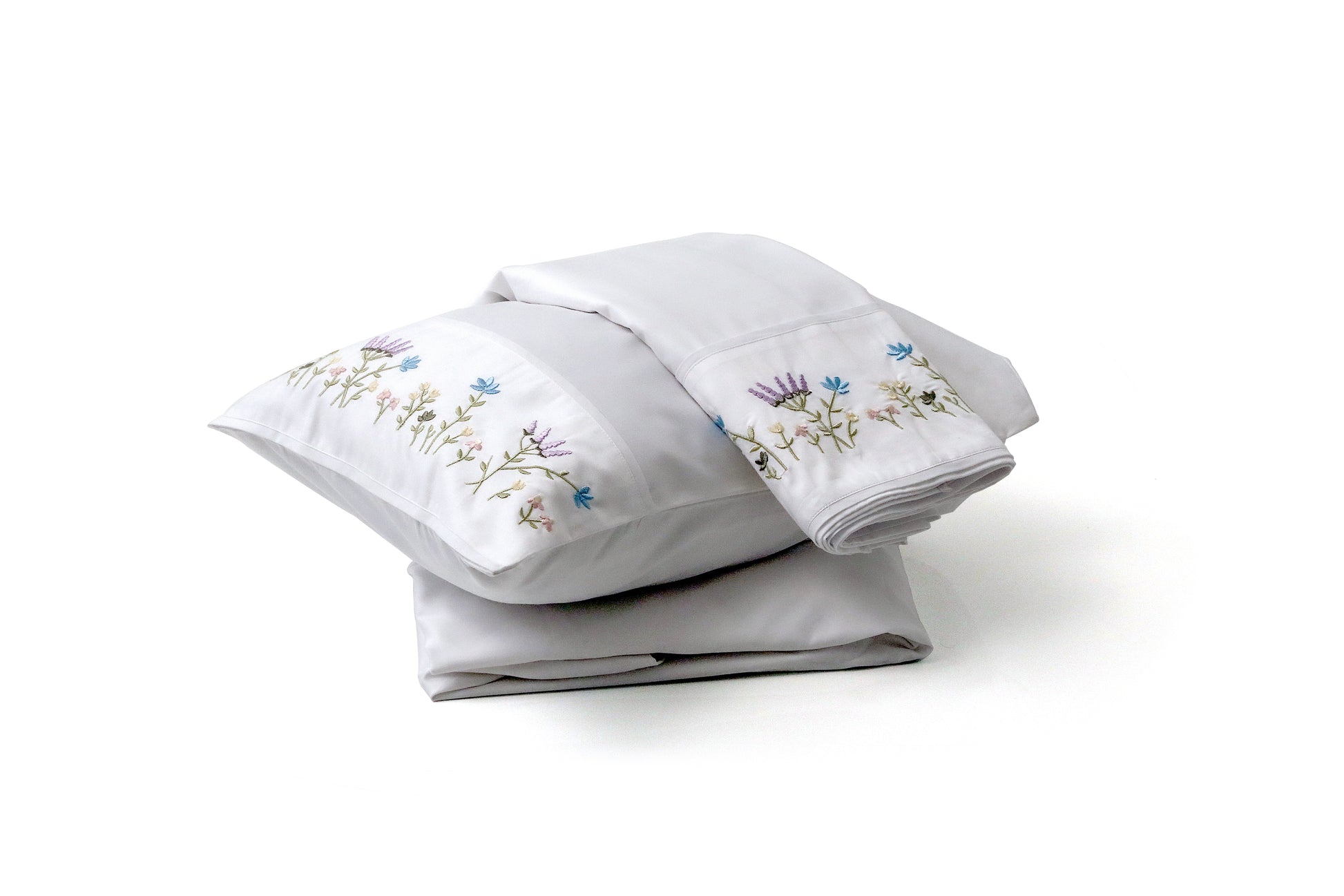 O Jogo de Lençol Bordado da Coleção Jardim é clássico e delicado, com bordado de pequenas folhas e flores coloridas em tons suaves.