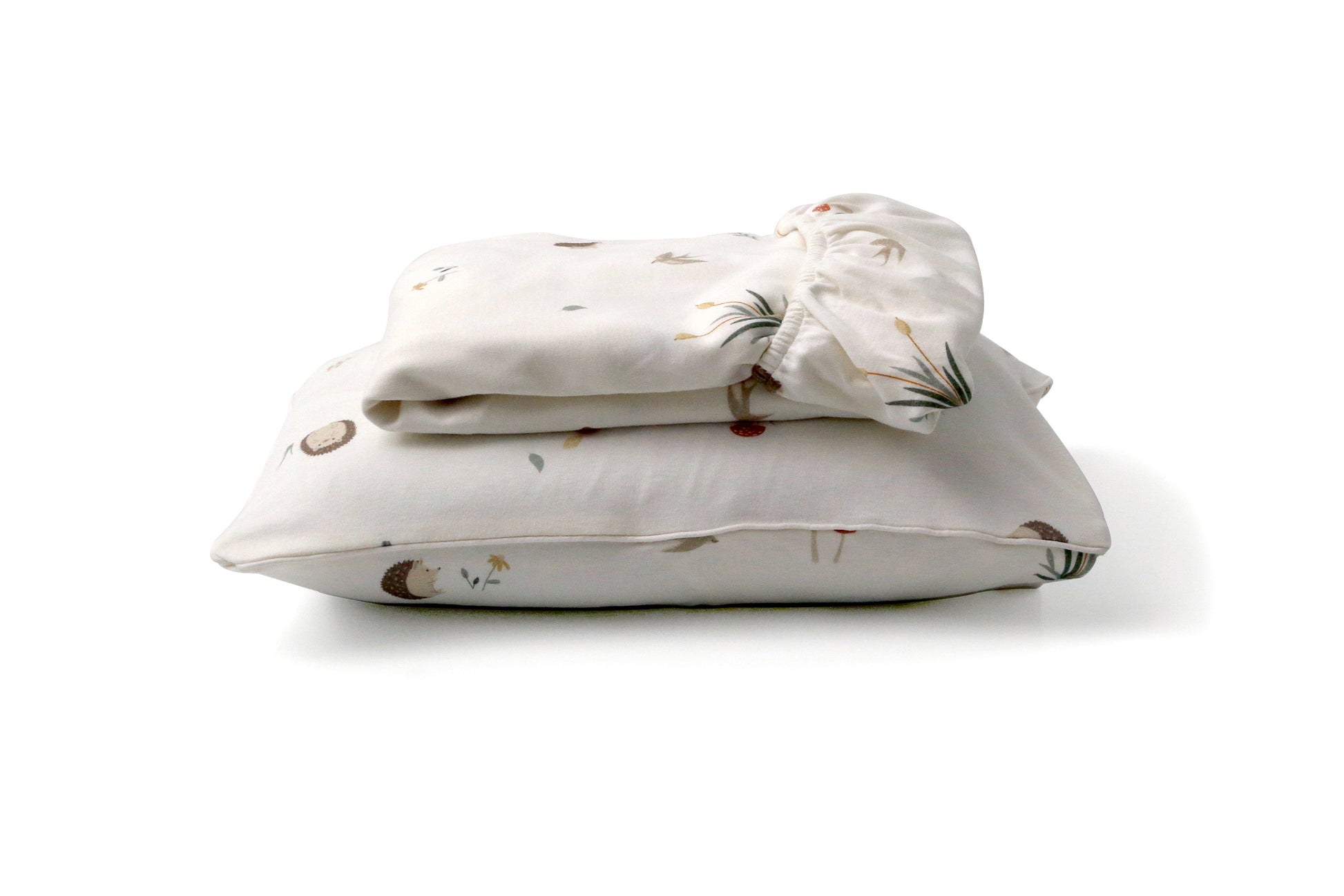 Com traços delicados e toque lúdico, o jogo de lençol da Coleção Ouriço traz uma estampa exclusiva com ouriços, plantinhas e cogumelos que transformam o quarto em um cantinho mais divertido e acolhedor.